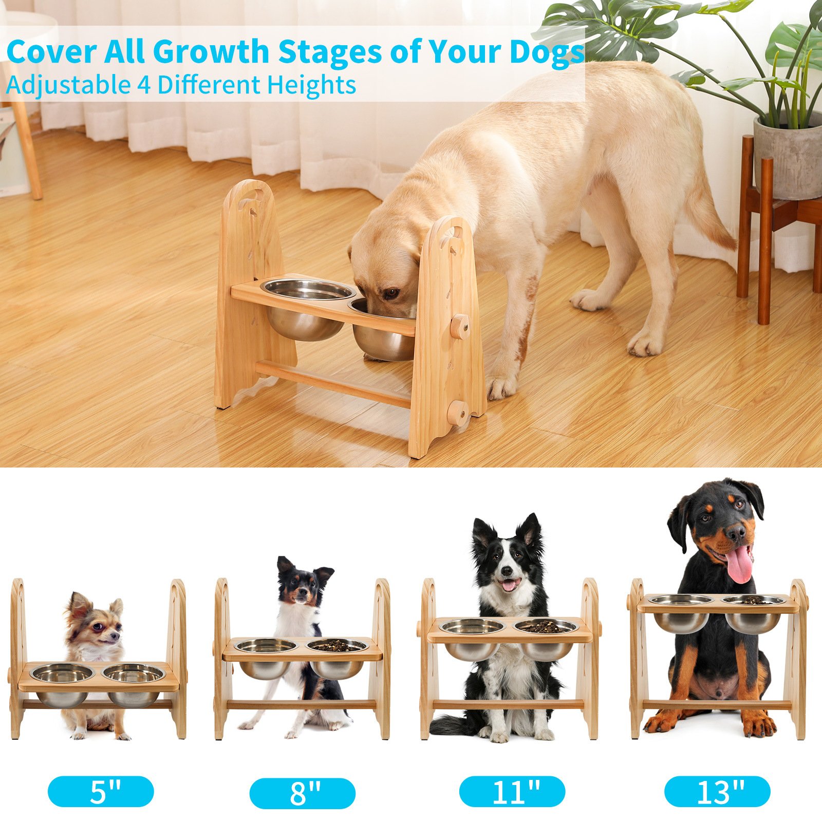 1.QKAMOR Elevated Raised Dog Bowls Can Adjusts 5 Adjustable Flat and Tilted Heights From 5” to 13.5”, Total 56oz(1600ml) Capacity Suits for Small Medium Large Sized Dogs, Cover Different Growth Stages of Your Dogs.
