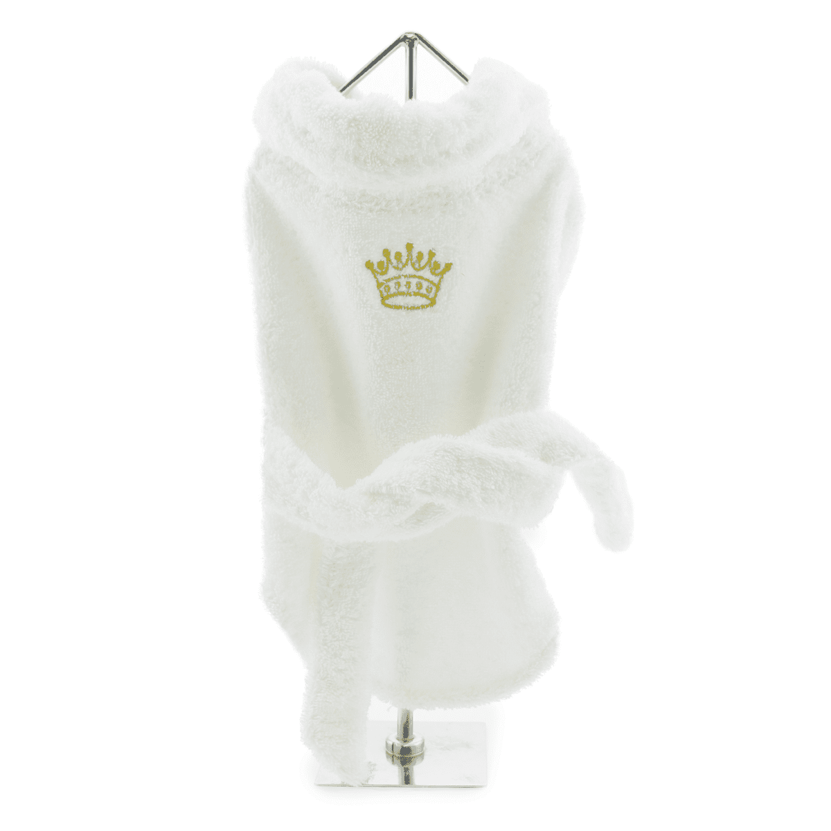 This robe features an embroidered gold crown for your little king or queen. The bathrobe has a hook and loop closure at the chest and a bathrobe tie around the back.