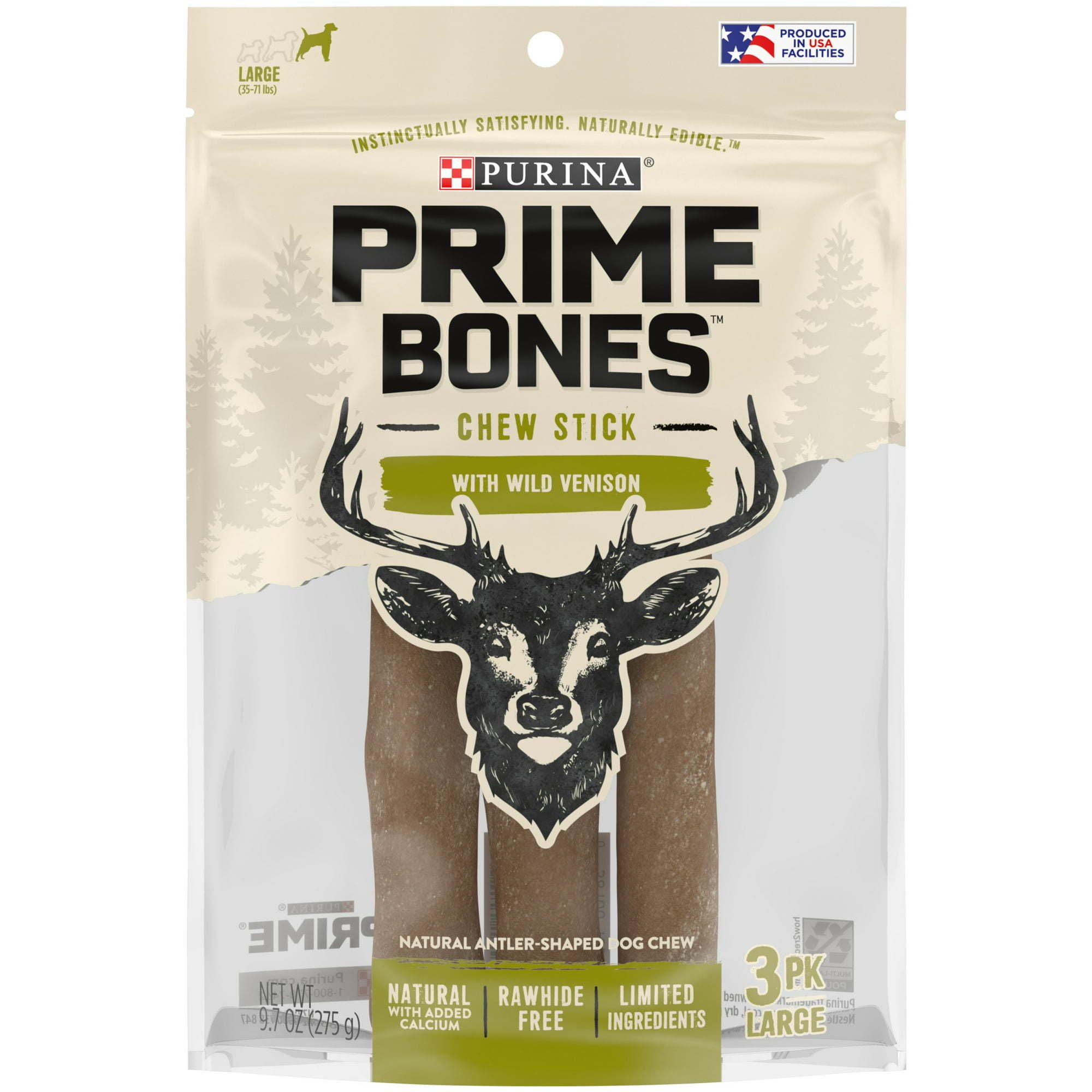 Purina Prime Bones Wild Venison Chew Stick Treats for Dog, Satisfy your dog's instinctual love of chewing with Purina Prime Bones Chew Stick With Wild Venison large dog bones. These extra-long-lasting, natural dog treats with added calcium are rawhide free and provide a safe and naturally edible treat that your large dog is sure to love. Each of these limited ingredient dog chew bones provides extra-long-lasting enjoyment with an antler-shaped chew to keep him entertained and thinking about his next big adventure in the wild. With big, untamed flavor, these dog bones for large dogs are just the right size for your large dog to chew, giving him rawhide free dog chews that help clean his teeth, too.